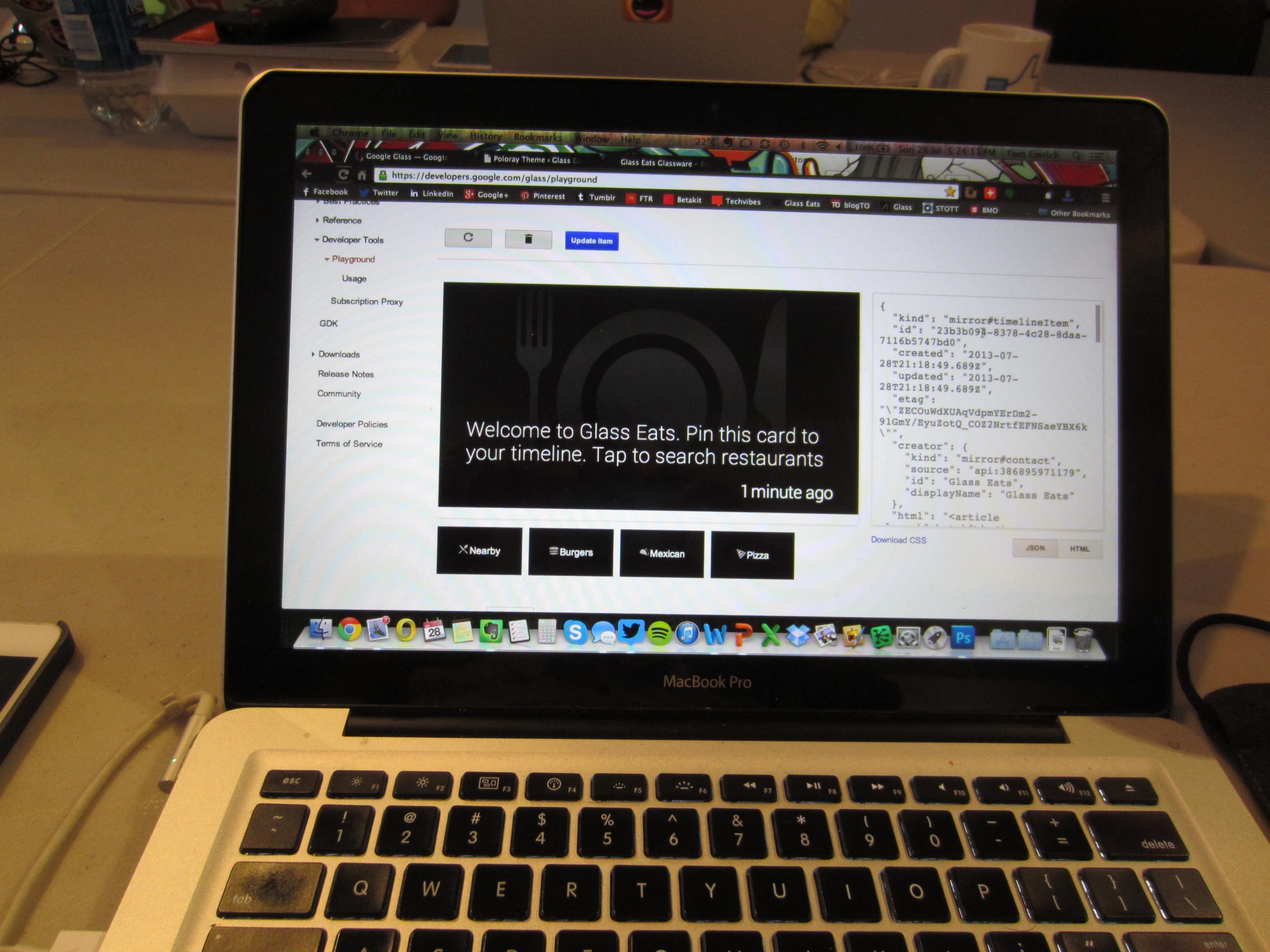 My app rounded out the bunch thanks to the help of Genesys software developer, Aaron Surty. Using the Yelp API, we created Glass Eats – a restaurant finder for Google Glass that provides users with restaurant choices nearby or search by restaurant category. The app uses both tappable menu actions and voice commands to send Glass users Yelp results and even goes as far as letting users call or get directions to a selected location from their device.